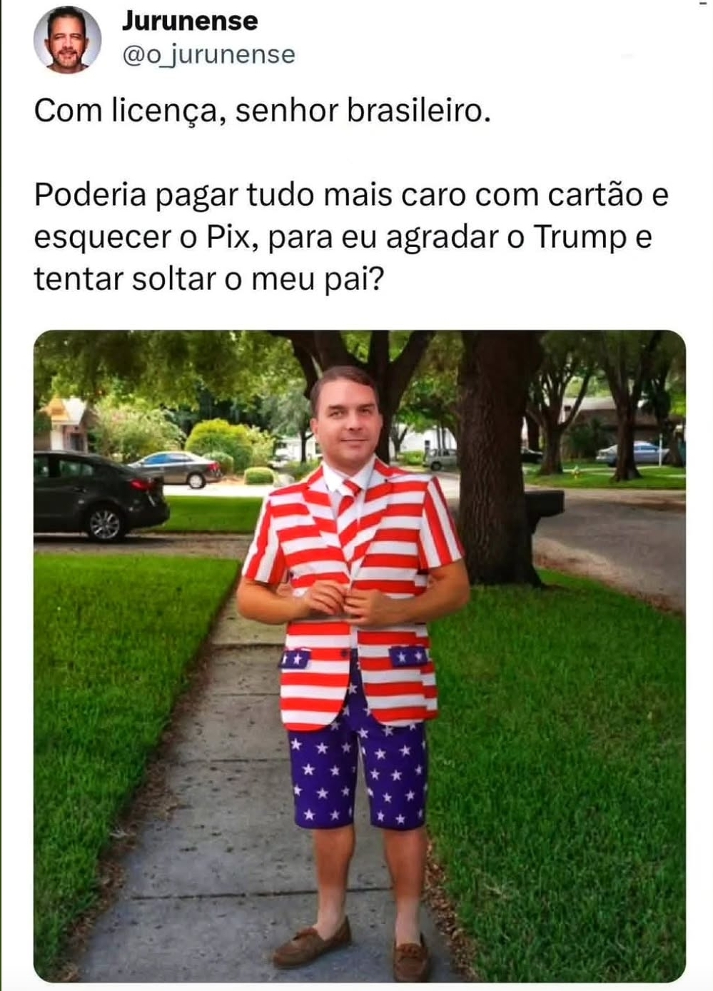 Se o Flávio ganhar, com certeza vai taxar o Pix e, para agradar Trump, vai cobrar taxas mais altas do que as cobradas pelos cartões das empresas americanas. O filhotinho do Trump não vai querer que seu chefe reclame que o Pix está fazendo concorrência desleal com as empresas americanas, não é? Mas o Flávio agradará o governo americano só porque é um americanista de coração? Claro que não. Certamente, quando visitar aquele país, desejará voltar com alguns presentes valiosos. Exatamente como seu pai fez quando voltava de países árabes. Para os Estados Unidos, ter um presidente corrupto no Brasil vai ser um grande negócio. Vai ser corrupto daquela estirpe que se contenta com espelhinhos e bugigangas.