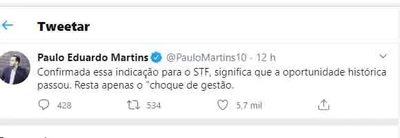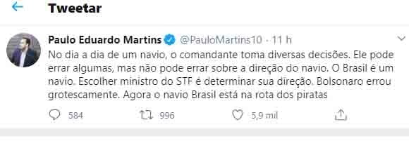 Com essa indicação, Bolsonaro quer matar três cobras com uma cajadada só: seu mandato, o mandato de seu filho no senado e sua reeleição! O futuro ministro indicado por Bolsonaro vai de cara relatar o processo em que Moro acusa o presidente de interferir na PF (pau no Moro traidor!) e relatar a ação que mantém ou tira o foro privilegiado do Flávio Bolsonaro. Qual pai que não quer salvar a pele do filho, não é mesmo? E, por fim, o novo ministro do STF vai, no mínimo, votar no processo movido pelo Lula acusando Moro de suspeição. Vai ser matar e enterrar a candidatura do Moro a presidente. Até porque as decisões de Moro, quando juiz, contra Lula não têm defesa que se possa fazer com base nas leis do país, já que a lava jato criou suas próprias leis. Esta semana mesmo, a juíza morista e substituta de Moro decidiu contra decisão do ex-ministro do Bolsonaro garantindo a legalidade das palestras proferidas por Lula e o dinheiro recebido por elas. A decisão de Moro era tão absurda que até a juíza que o substituiu na lava jato decidiu contra ele. E os babacas achando que Bolsonaro ia colocar um religioso fanático no STF pra atacar o aborto até no estupro e defender a inconstitucional Escola sem Partido.