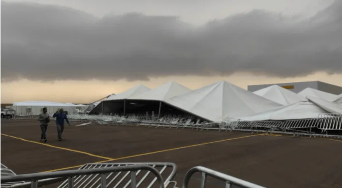 Vento e chuva fortes derrubam tenda que abrigaria o presidente Jair Bolsonaro e comitiva no evento de hoje no aeroporto de Maringá.